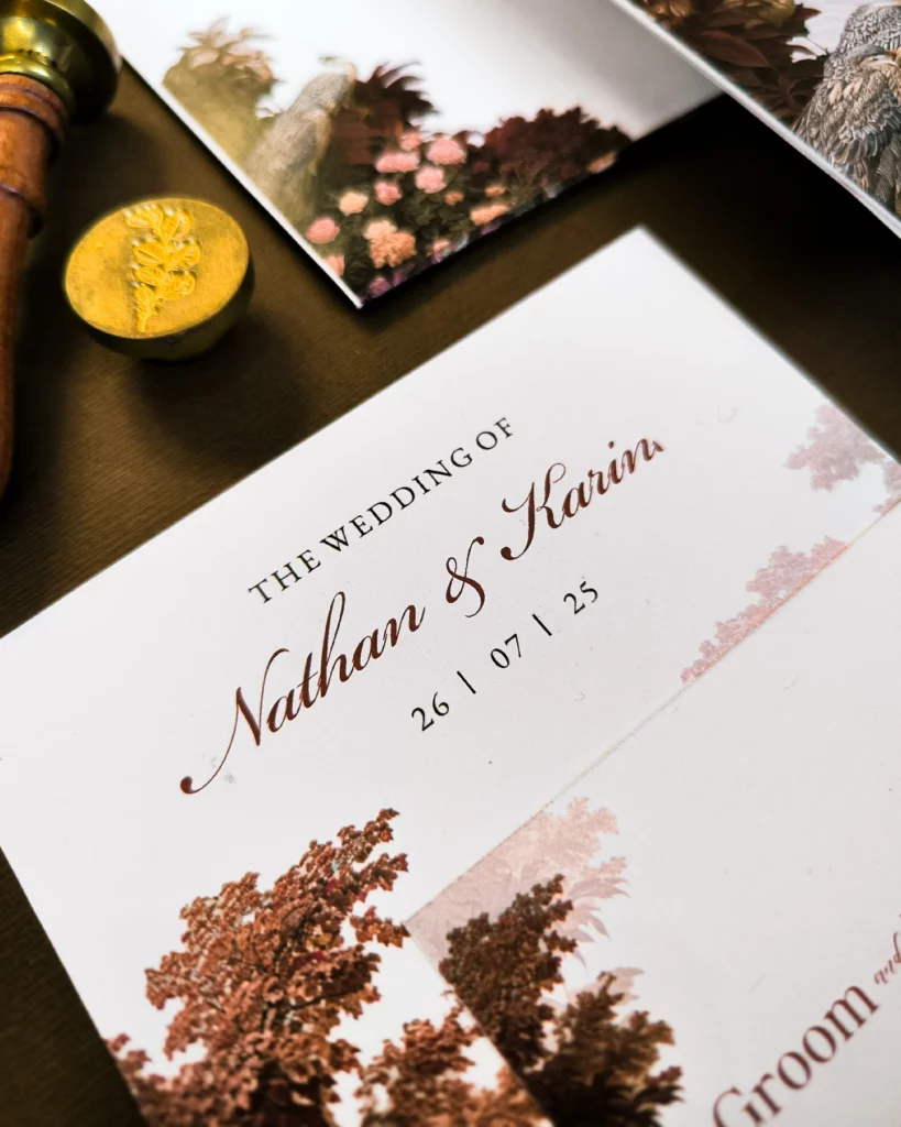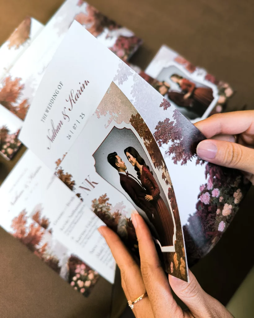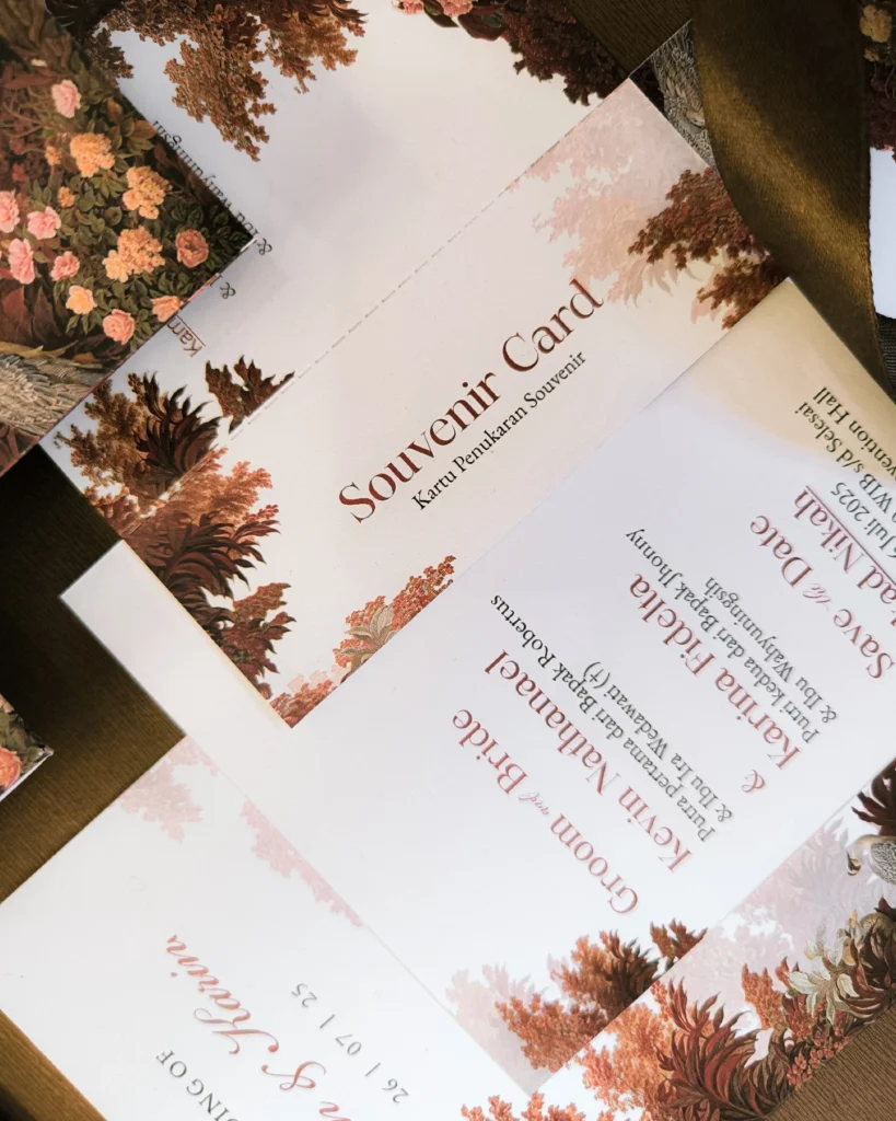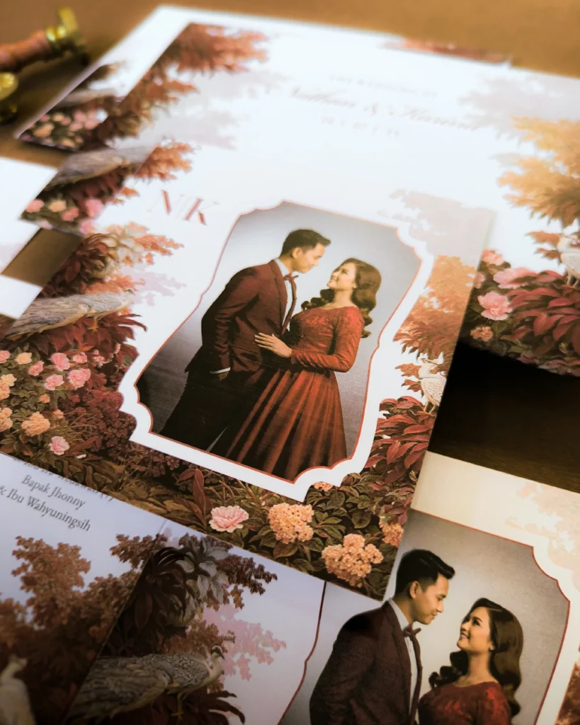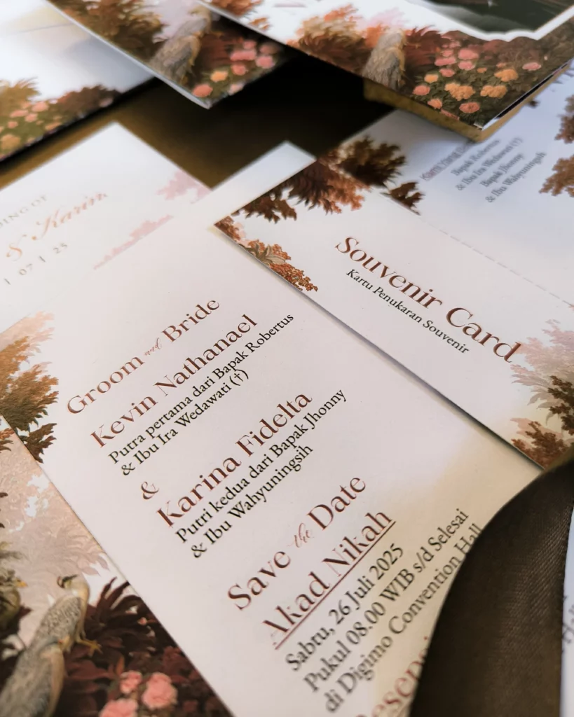 Amplop dirancang dengan warna senada untuk menciptakan kesatuan visual yang harmonis, cocok untuk konsep pernikahan minimalis, rustic, klasik modern, hingga garden wedding. Detail kecil seperti lipatan presisi dan permukaan kertas yang halus menjadikan undangan terasa rapi dan berkelas saat dipegang.