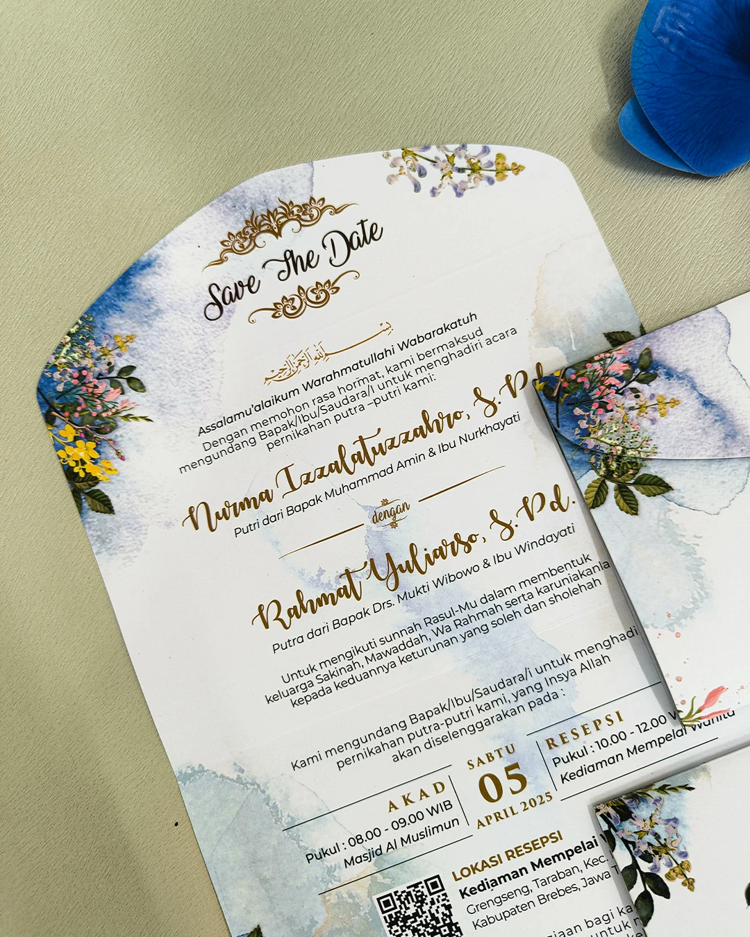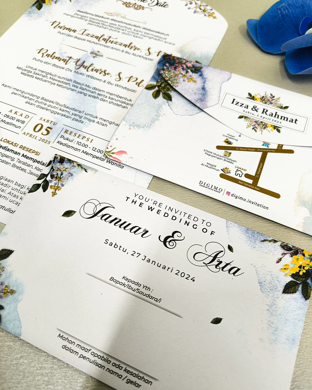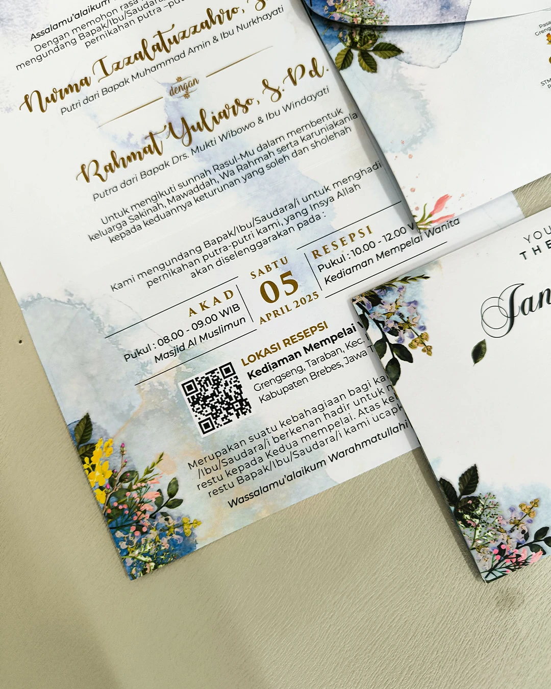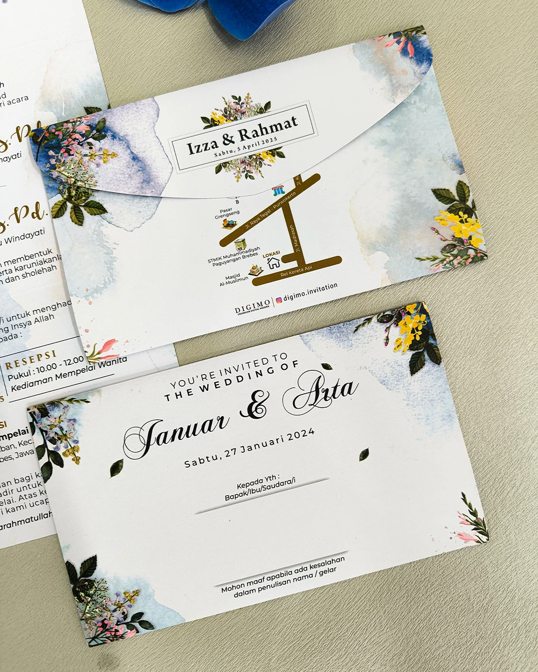Amplop dirancang dengan warna senada untuk menciptakan kesatuan visual yang harmonis, cocok untuk konsep pernikahan minimalis, rustic, klasik modern, hingga garden wedding. Detail kecil seperti lipatan presisi dan permukaan kertas yang halus menjadikan undangan terasa rapi dan berkelas saat dipegang.