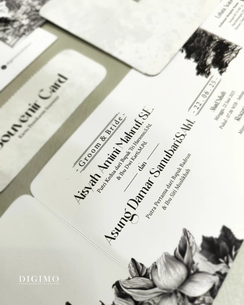 Amplop dirancang dengan warna senada untuk menciptakan kesatuan visual yang harmonis, cocok untuk konsep pernikahan minimalis, rustic, klasik modern, hingga garden wedding. Detail kecil seperti lipatan presisi dan permukaan kertas yang halus menjadikan undangan terasa rapi dan berkelas saat dipegang.