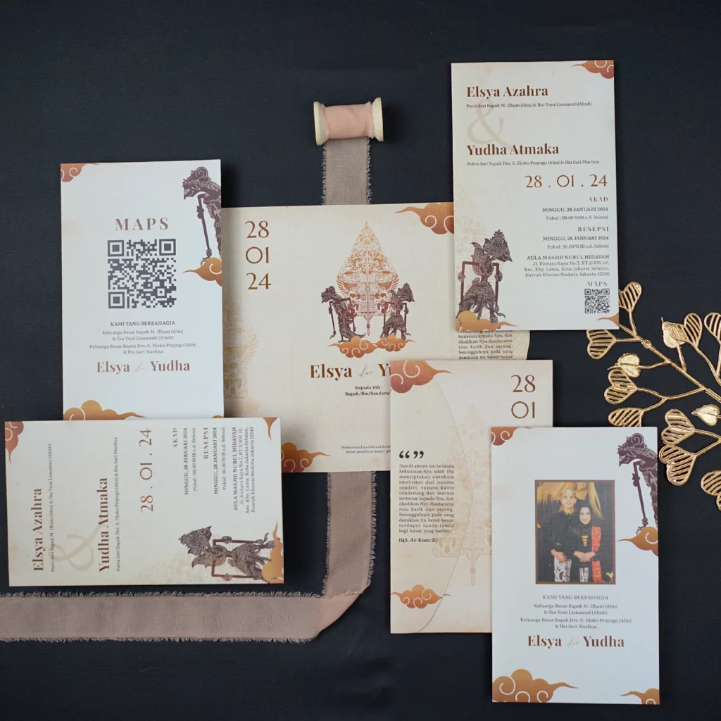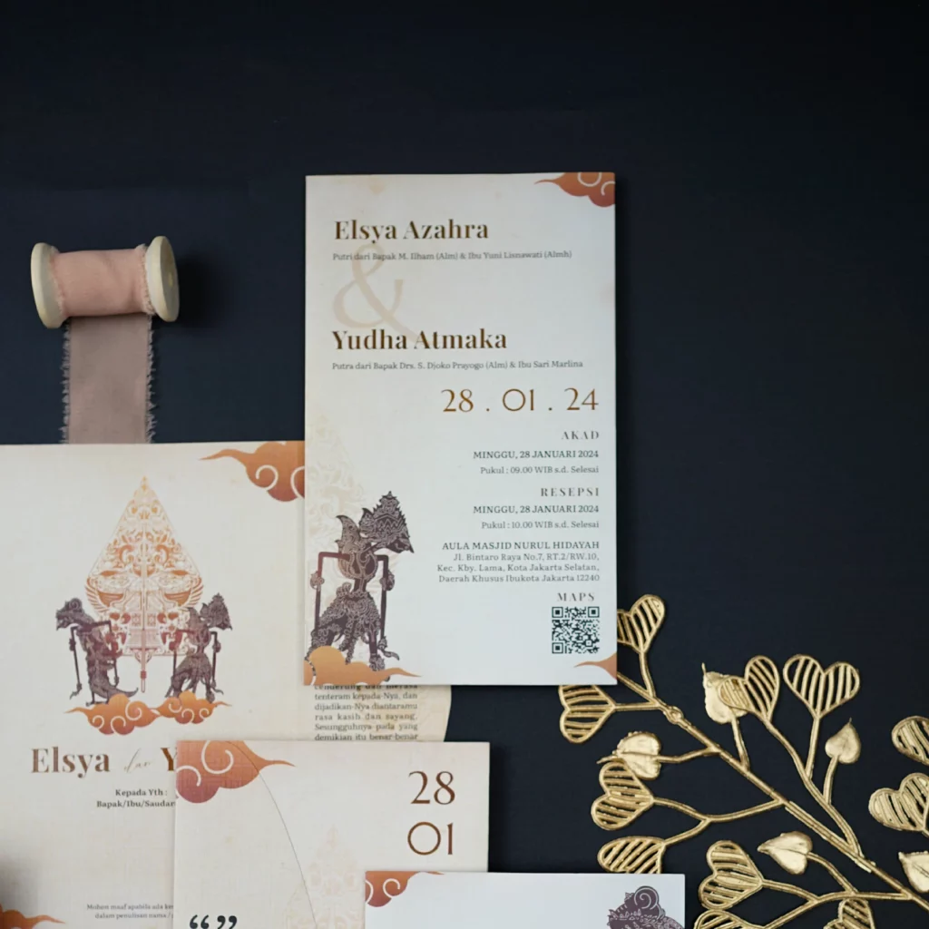 Amplop dirancang dengan warna senada untuk menciptakan kesatuan visual yang harmonis, cocok untuk konsep pernikahan minimalis, rustic, klasik modern, hingga garden wedding. Detail kecil seperti lipatan presisi dan permukaan kertas yang halus menjadikan undangan terasa rapi dan berkelas saat dipegang.