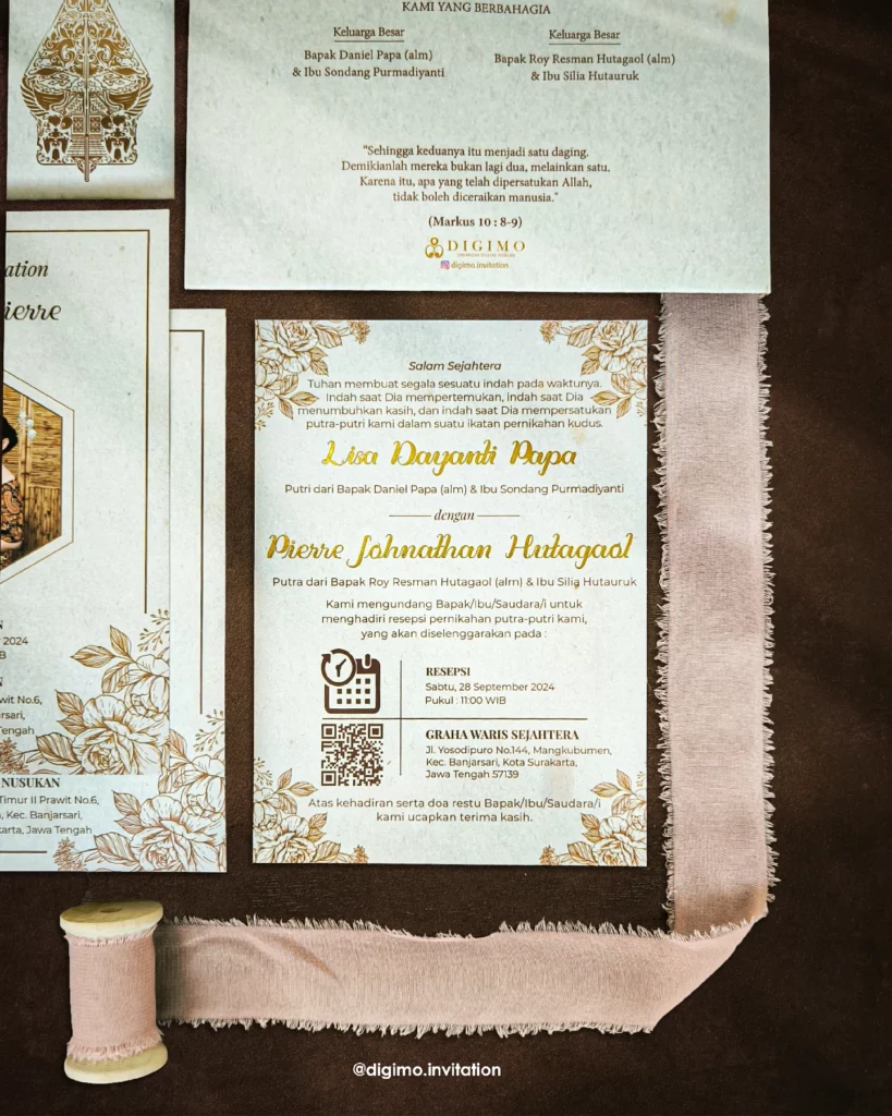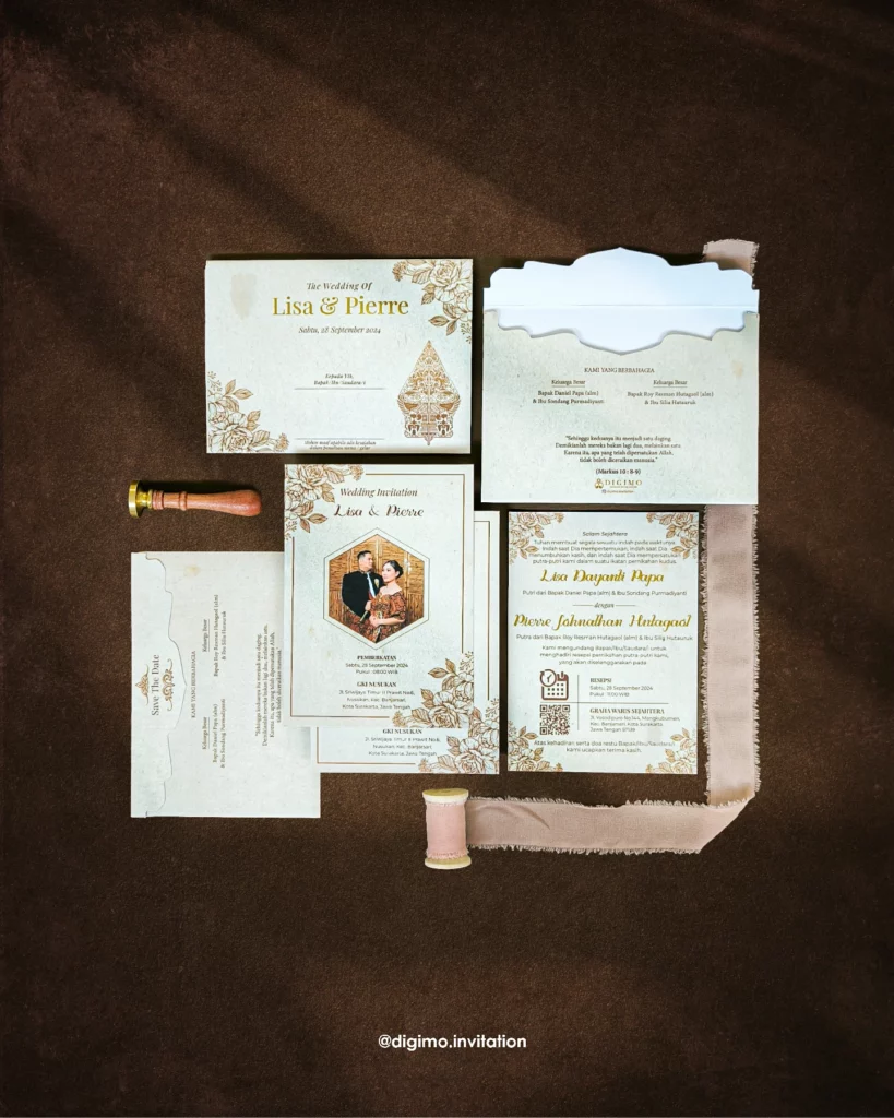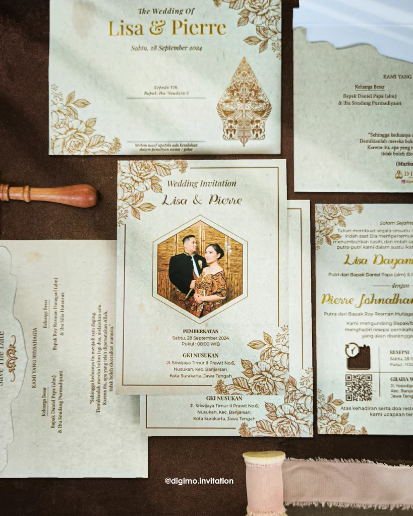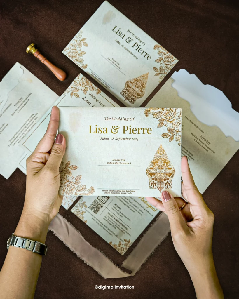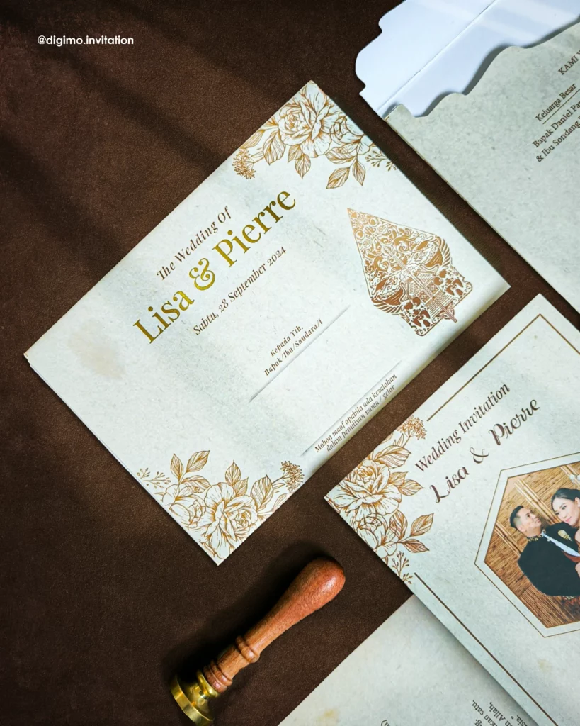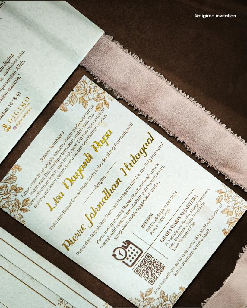 Amplop dirancang dengan warna senada untuk menciptakan kesatuan visual yang harmonis, cocok untuk konsep pernikahan minimalis, rustic, klasik modern, hingga garden wedding. Detail kecil seperti lipatan presisi dan permukaan kertas yang halus menjadikan undangan terasa rapi dan berkelas saat dipegang.