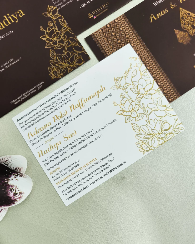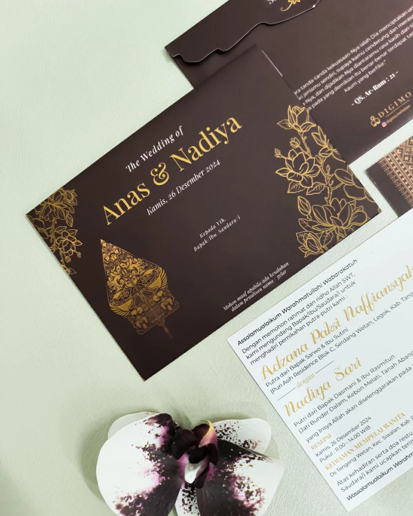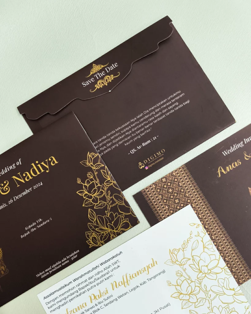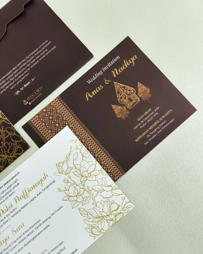 Amplop dirancang dengan warna senada untuk menciptakan kesatuan visual yang harmonis, cocok untuk konsep pernikahan minimalis, rustic, klasik modern, hingga garden wedding. Detail kecil seperti lipatan presisi dan permukaan kertas yang halus menjadikan undangan terasa rapi dan berkelas saat dipegang.