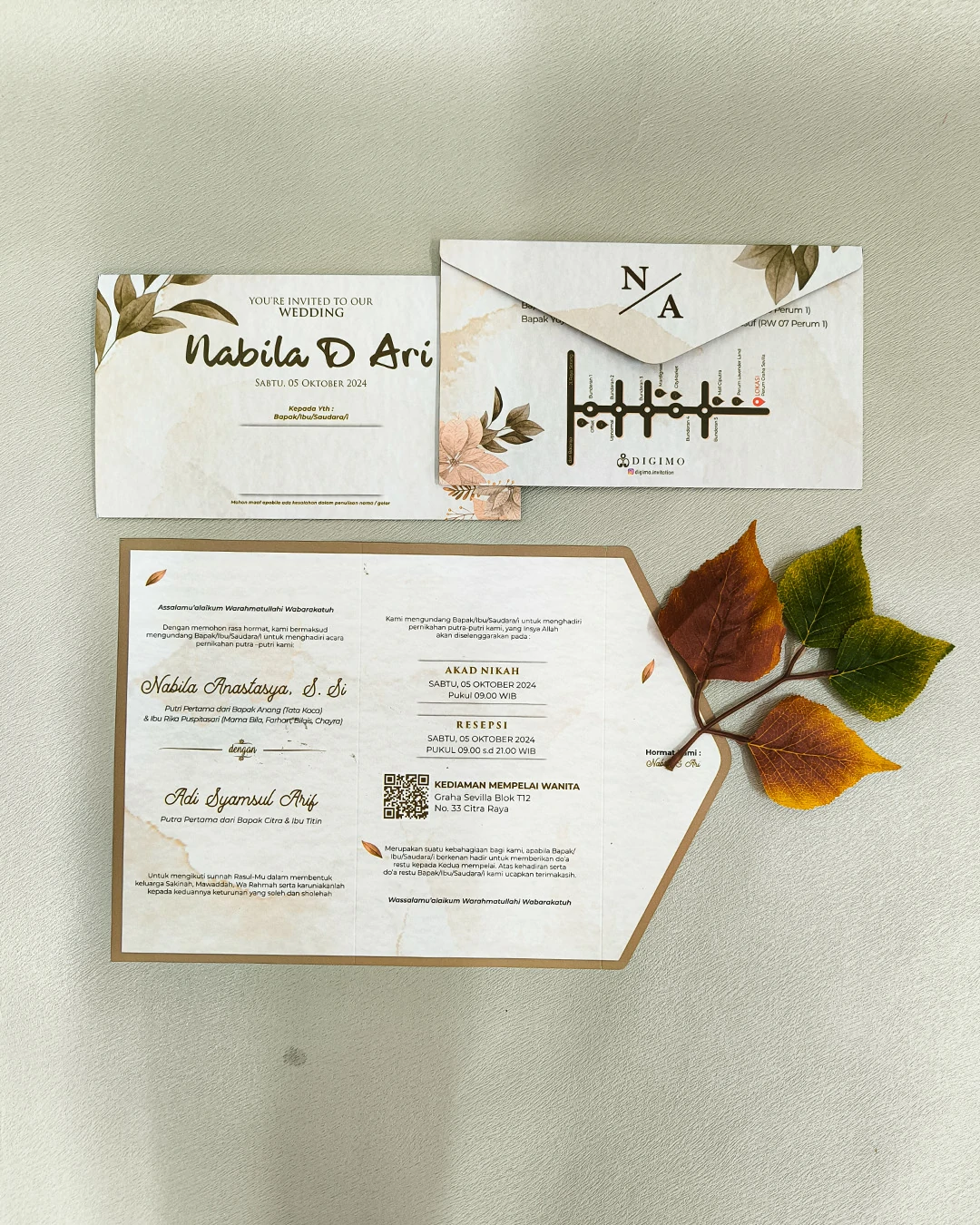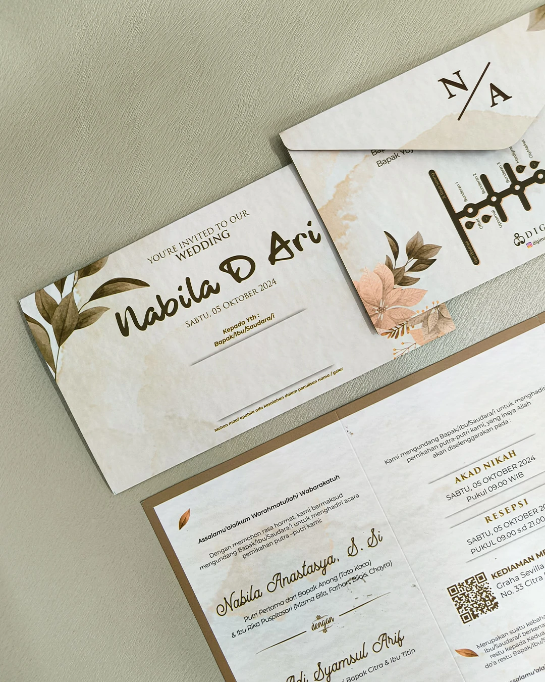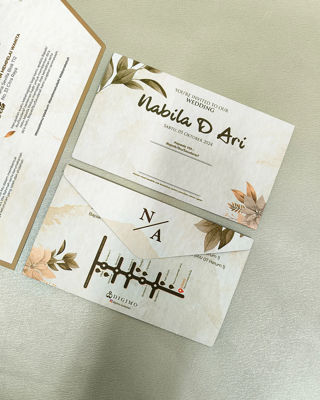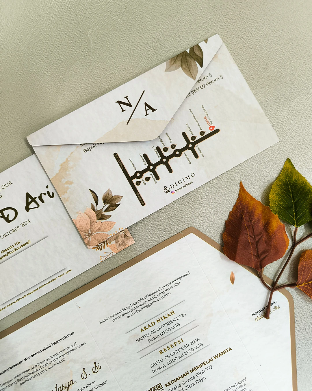 Amplop dirancang dengan warna senada untuk menciptakan kesatuan visual yang harmonis, cocok untuk konsep pernikahan minimalis, rustic, klasik modern, hingga garden wedding. Detail kecil seperti lipatan presisi dan permukaan kertas yang halus menjadikan undangan terasa rapi dan berkelas saat dipegang.