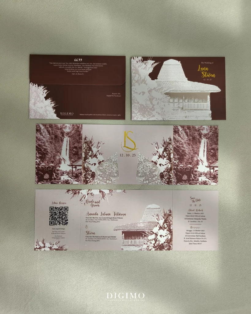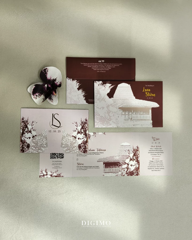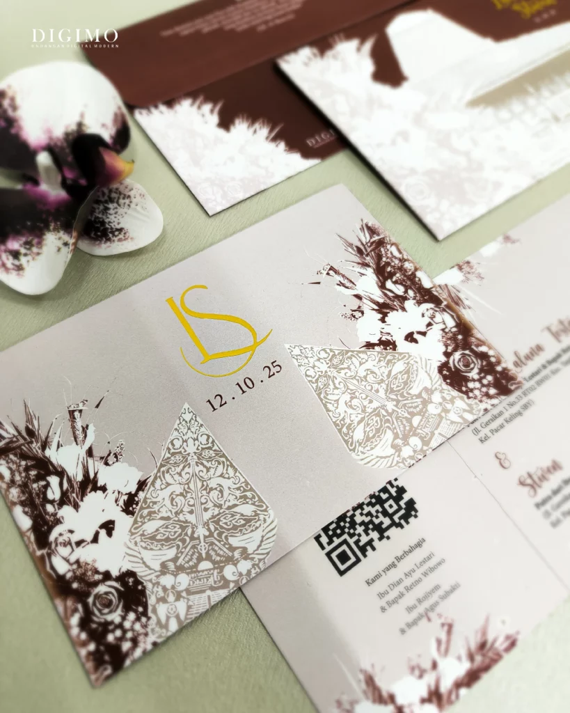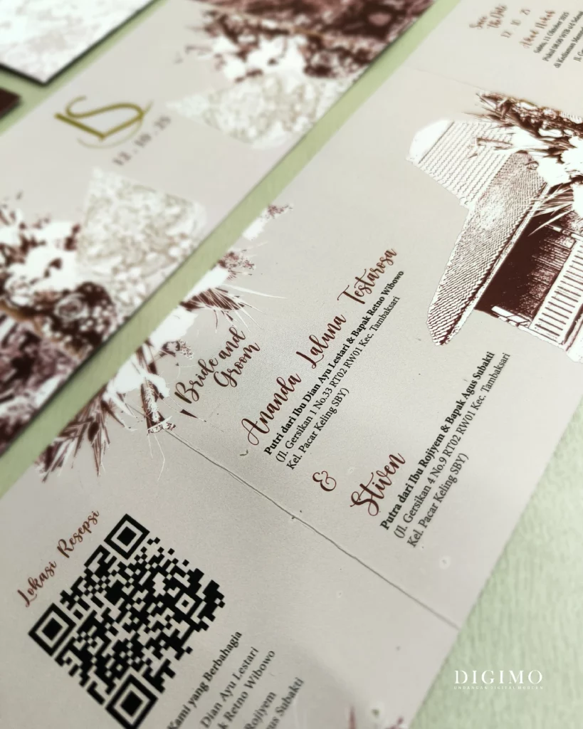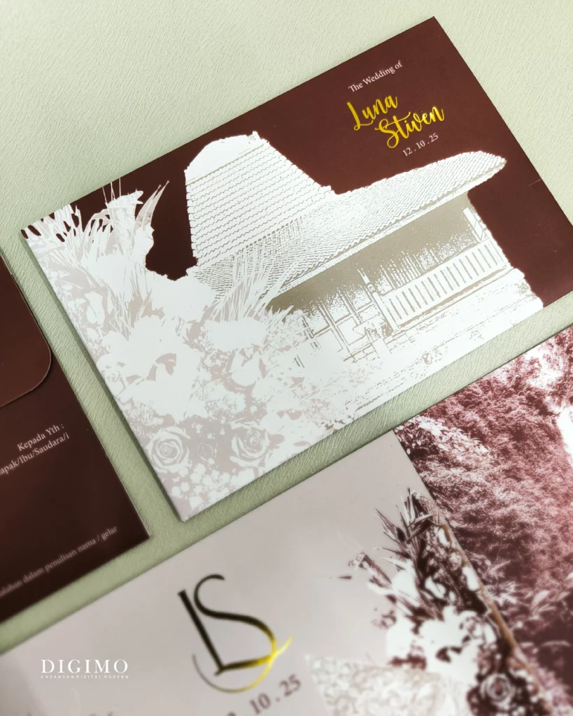 Amplop dirancang dengan warna senada untuk menciptakan kesatuan visual yang harmonis, cocok untuk konsep pernikahan minimalis, rustic, klasik modern, hingga garden wedding. Detail kecil seperti lipatan presisi dan permukaan kertas yang halus menjadikan undangan terasa rapi dan berkelas saat dipegang.